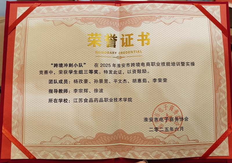 2025年3月至6月,淮安市举办主题为“链接跨境‘淮’抱全球”的跨境电商职业技能培训暨实操竞赛。我院高度重视、精心组织、积极参训参赛,取得优异成绩:我院荣获“优秀组织奖”;李宗辉老师、徐波老师荣获“优秀指导教师奖”;学生杨孜豪、孙景昱、平文杰、胡惠茹、李荣荣(排名不分先后)荣获学生组三等奖。