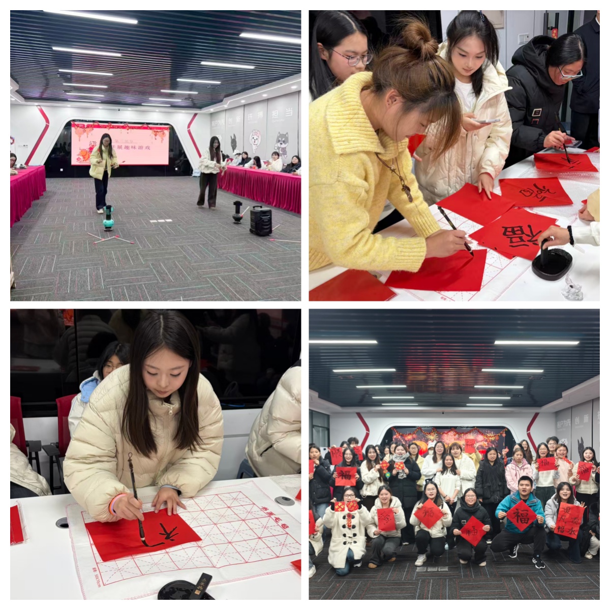 趣味互动与传统文化体验相得益彰。投壶游戏中,同学们分组挑战、协作比拼,在传统民俗的欢乐氛围中强化团队意识;写福字和春联活动里,大家挥毫泼墨,将新年期许与红色祝福融入笔墨,让传统文化与红色情怀深度交融,活动最后全体成员手持作品合影留念,为活动画上圆满句号。