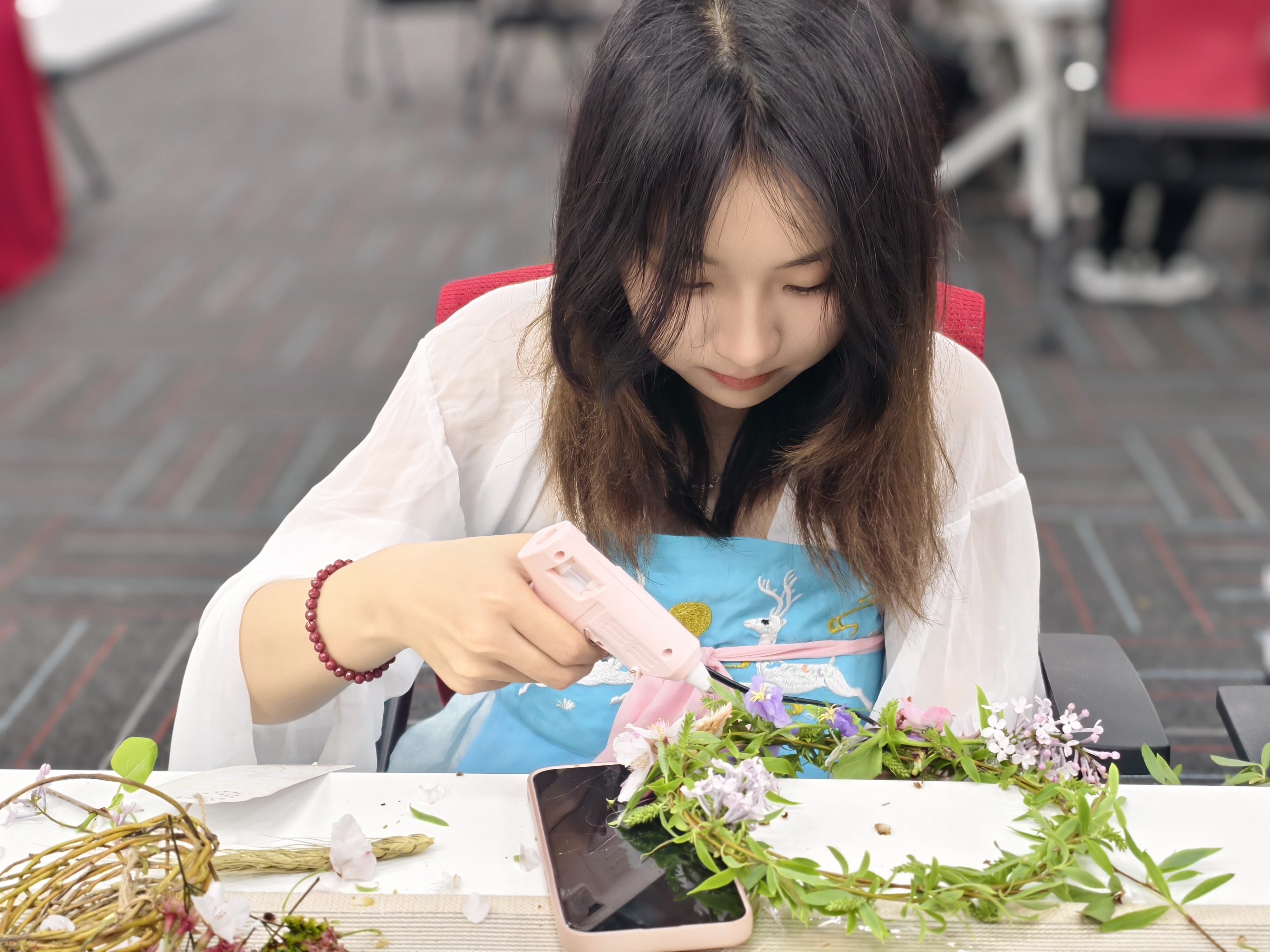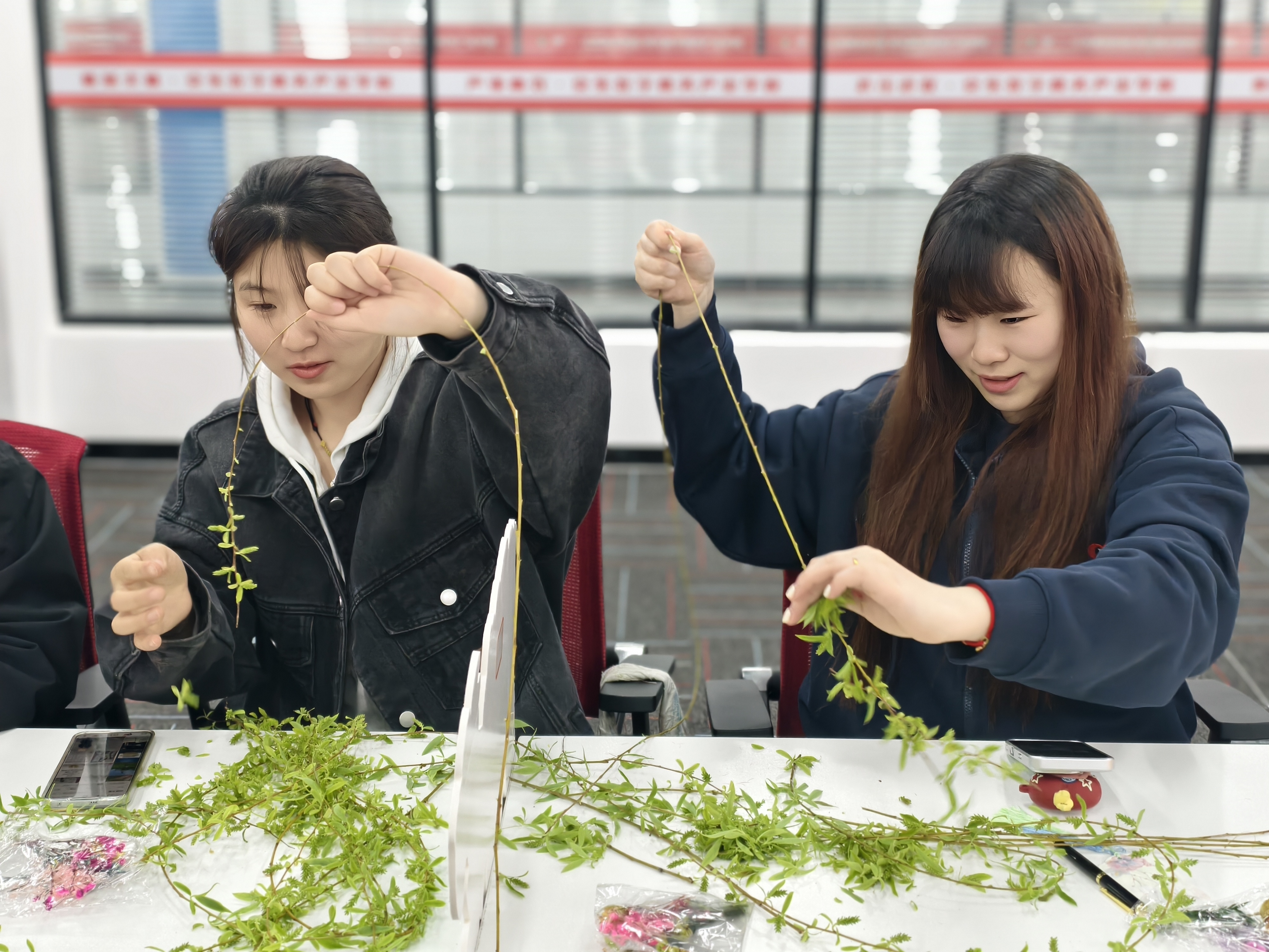 在柳编DIY环节,同学们化身“手艺人”,亲身体验柳编的制作乐趣。柳编编织以经纬交织为核心,大家取粗柳条做经条,交叉固定成“米”字形,再用细柳条做纬条,从交叉点顺时针紧贴缠绕,力求松紧均匀,在指尖的翻飞中逐步勾勒出柳编雏形。待柳编雏形晾干定型后,同学们又用干花、丝带、颜料等工具精心装饰,按需点缀,让朴素的柳编增添了独特韵味,每一件作品都被赋予了专属的心意与温情,成为寄托清明追思的独特载体。