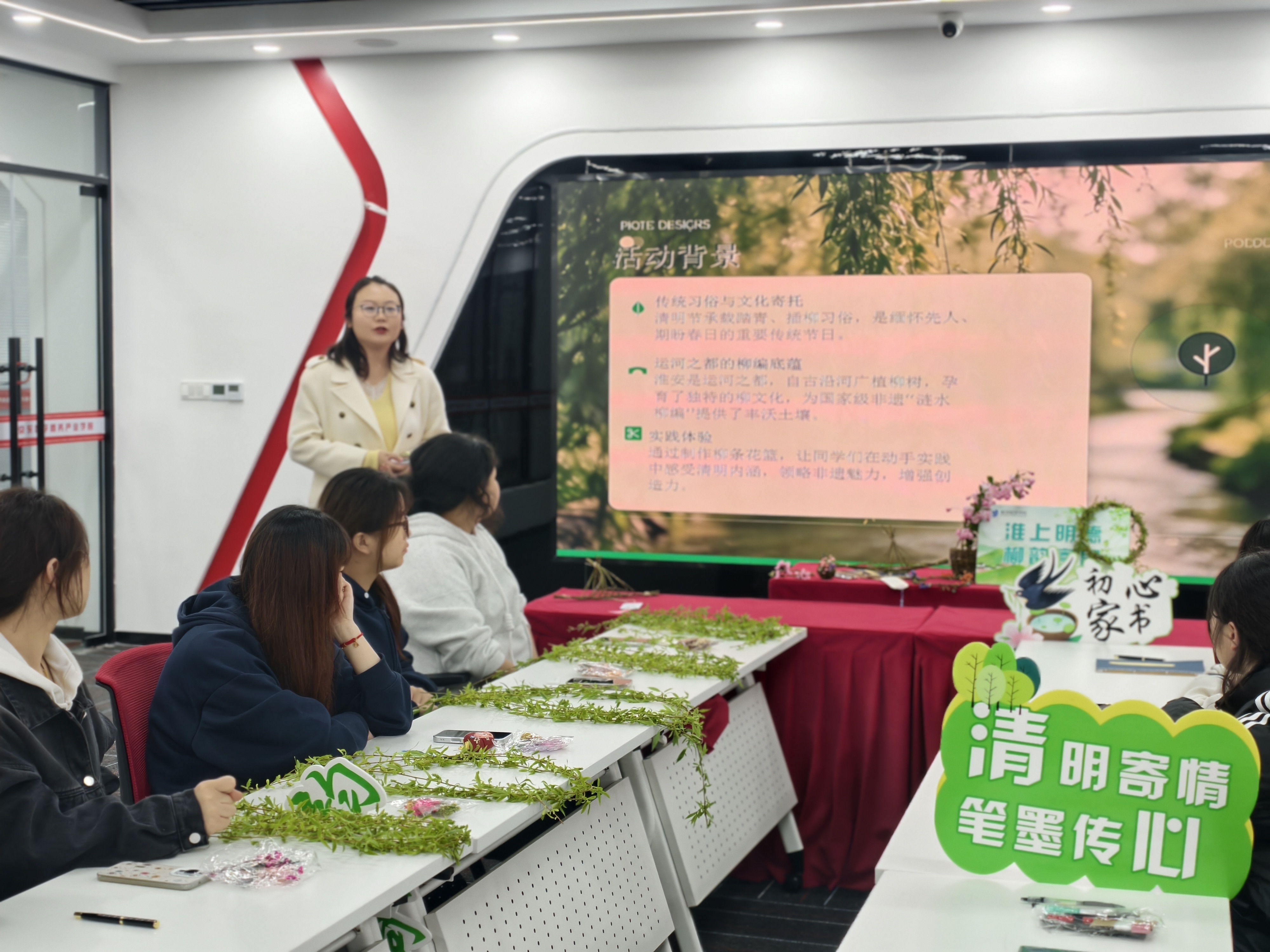 活动伊始,学院党总支书记王婧妍带领同学们走进清明的文化深处,探寻“折柳寄思”的古老习俗,解读淮安大运河与涟水柳编千丝万缕的联系。作为涟水县县级非物质文化遗产,柳编技艺是淮安本土文化的重要组成部分,大运河的滋养让这门民间技艺在淮上大地生根发芽、代代相传。同学们在讲解中感受着本土民间技艺的独特魅力,体会着传统工艺背后的匠心与坚守。