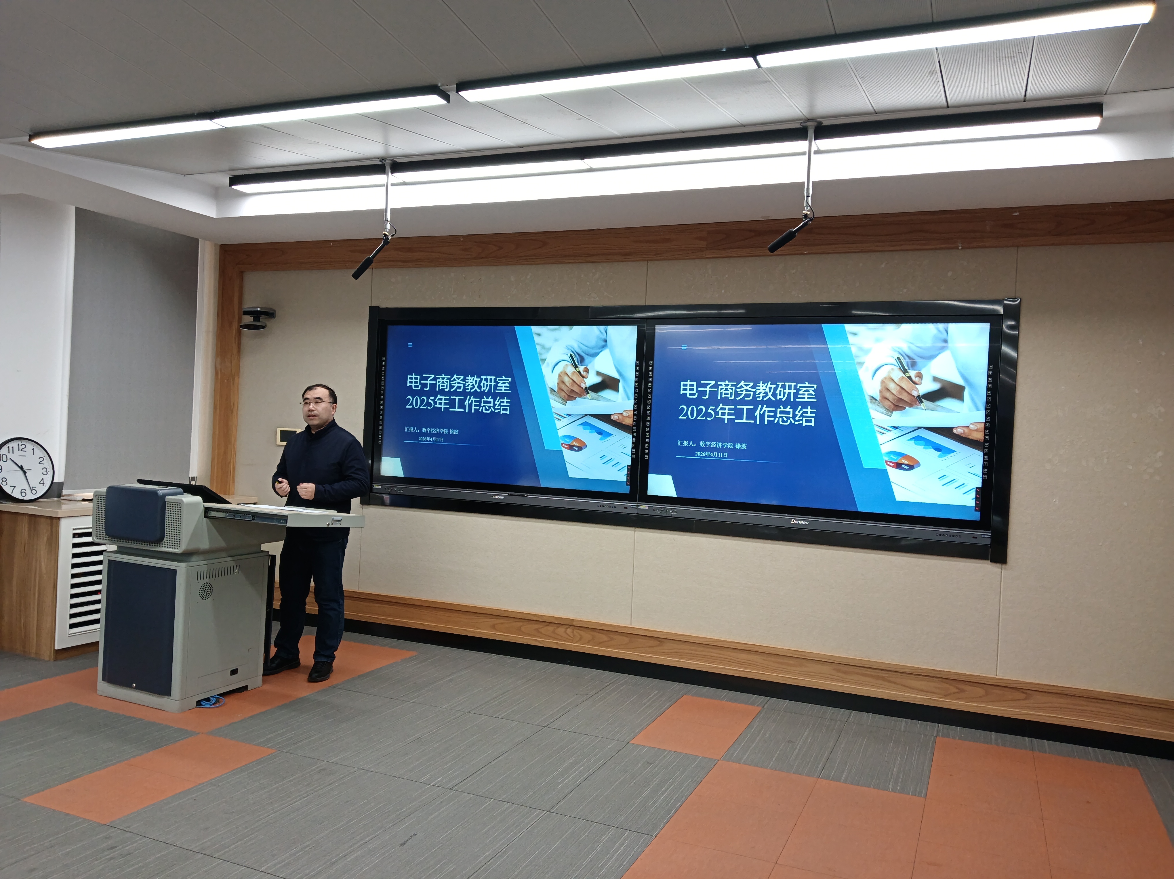 电子商务教研室主任徐波老师,介绍了电子商务教研室在2025年工作中取得的丰硕成果,也分析了不足,例如实战项目覆盖范围窄、校企合作成果转化教学资源不足等,将这几个方面作为2026年的工作重点,力求突破。