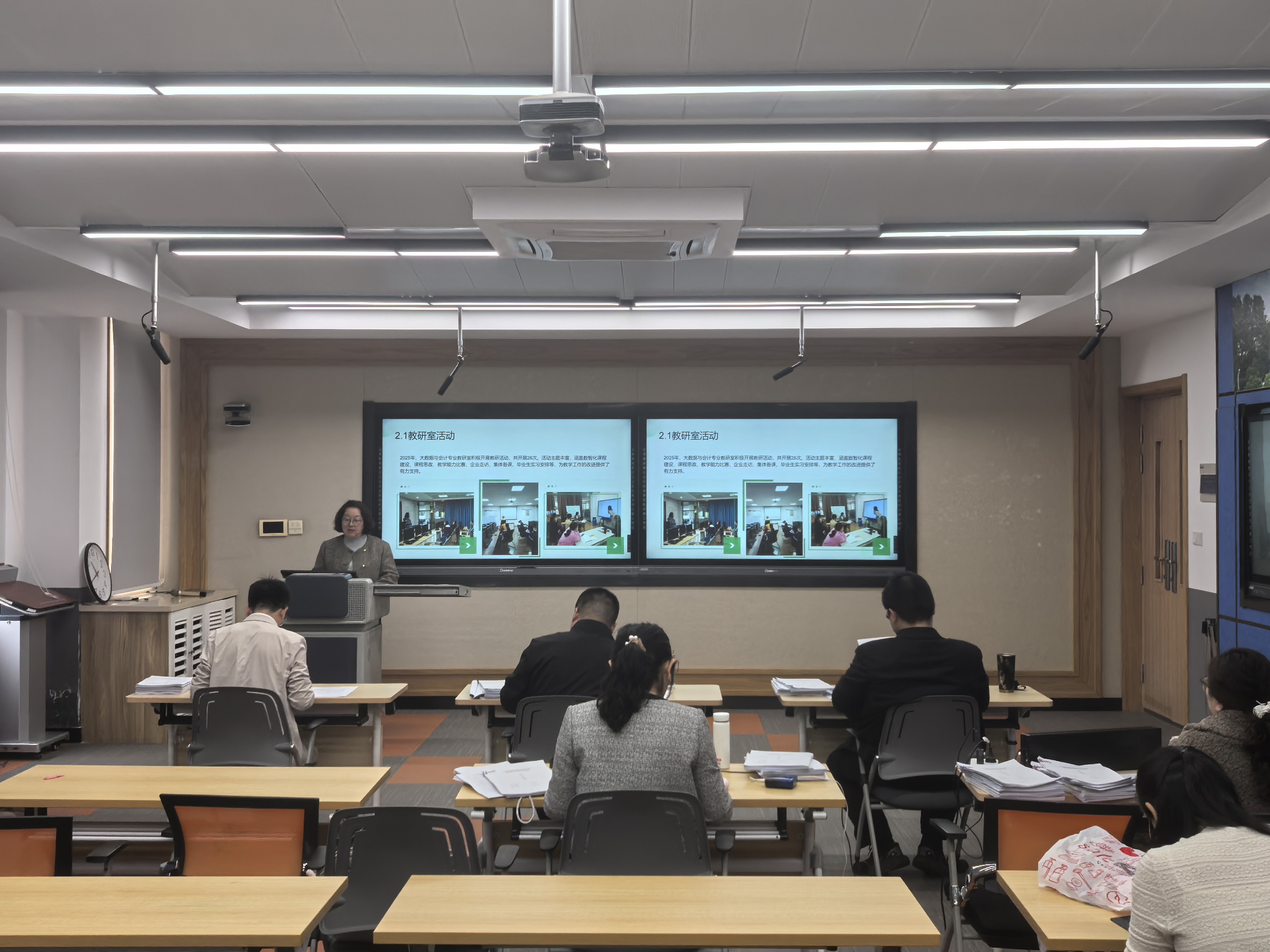 大数据与会计教研室主任何春老师,将团队老师一年的工作业绩进行了展示,针对专业建设中存在的科研工作短板也提出了具体的改进方案。